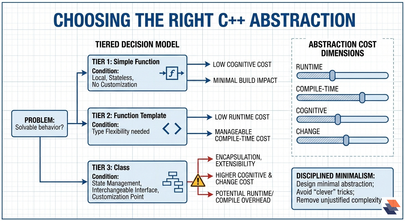 This cost may not be at runtime, but could be compile-time overhead or added code complexity. For instance, template instantiations can incur heavy compile-time costs even when they impose little or no runtime penalty. As one accepted definition puts it, zero-cost abstractions in C++ mean “no runtime cost, only compile time cost (the code will be slower to compile)”. In practice, template-heavy code can slow builds and strain developers’ ability to reason about the code. Maintaining a balance is essential.