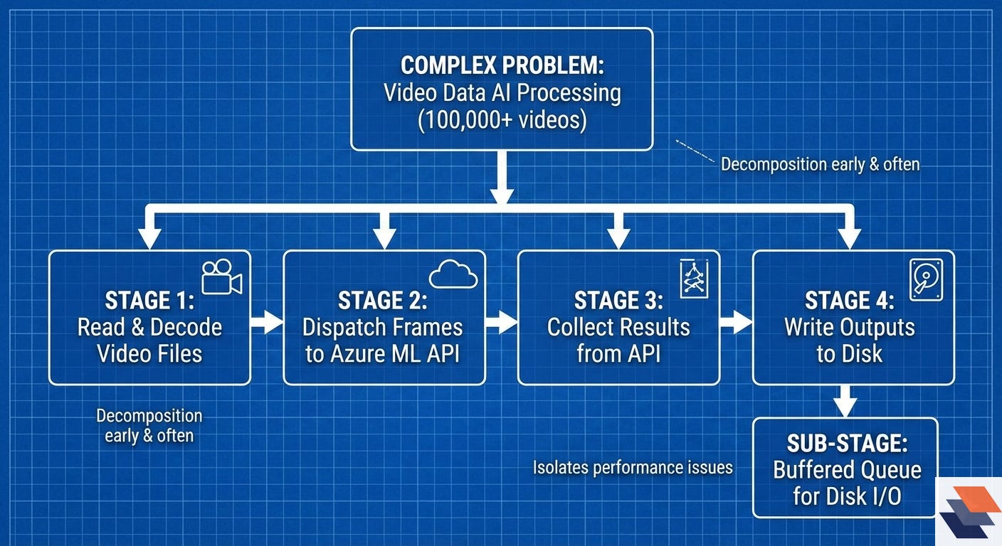 Morley split it into four stages: reading and decoding video files, dispatching frames to the cloud API (with careful rate limiting), collecting the results, and writing outputs to disk. Each stage was further subdivided: for example, the output-writing stage gained a buffered queue to prevent slow disk writes from bottlenecking the faster network responses. This iterative divide-and-conquer approach revealed hidden bottlenecks (disk I/O in this case) and allowed targeted fixes (introducing back-pressure when the buffer grew).