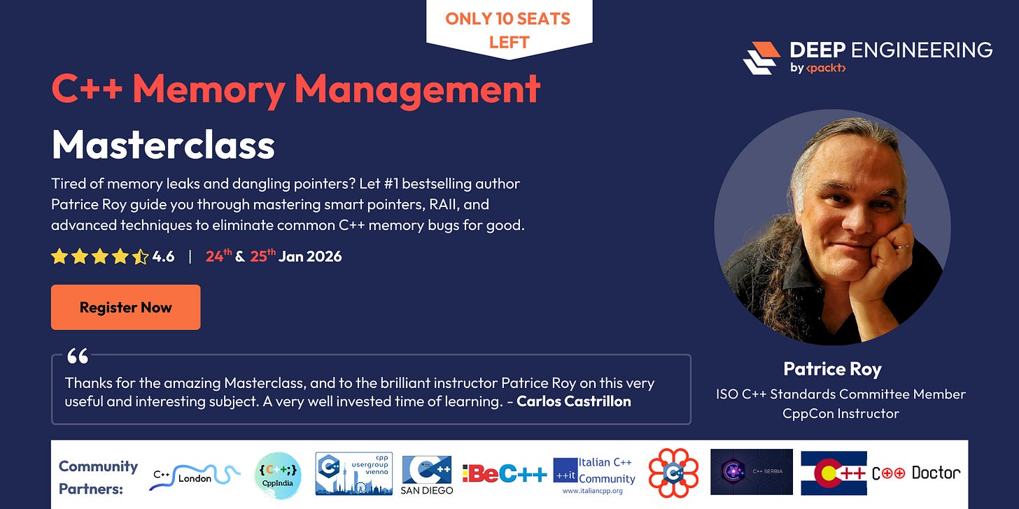 We are back with cohort two of our live, hands-on workshop with Patrice Roy (author of C++ Memory Management, ISO C++ WG21 member) focused on practical ownership models, RAII, smart pointers, exception safety, allocators, and debugging memory issues in production C++ code. Use code DEEPENG50 for 50% off Standard and Bulk tickets (not valid on Premium Pass).