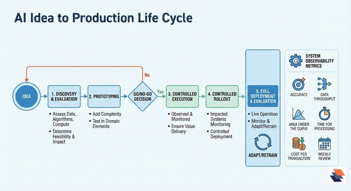 As AI engineering is maturing, a notional process is emerging that takes an AI idea to production. The initial stage is discovery and evaluation. It looks to determine if the data, algorithms, and compute resources exist to make a system that will have impact. The next stage is prototyping; here one now adds complexity to the software, both by adding more production domain elements, to test how well the new system would work. It is at the end of the prototype phase where a key decision is made to determine if it is warranted to take the prototype to a production environment.