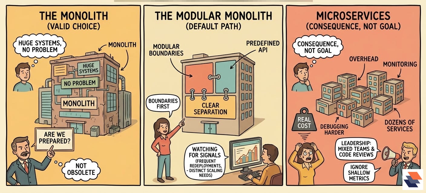 Veen explains where the cost shows up. Microservices require “a lot more overhead” in monitoring, and debugging grows harder when incidents span “dozens or hundreds of services.” His default is a “modular monolith,” where modules have clear boundaries and must use a “predefined API” to interact. He then watches for signals that justify extraction, such as a module that forces frequent redeployments or has distinct scaling needs.