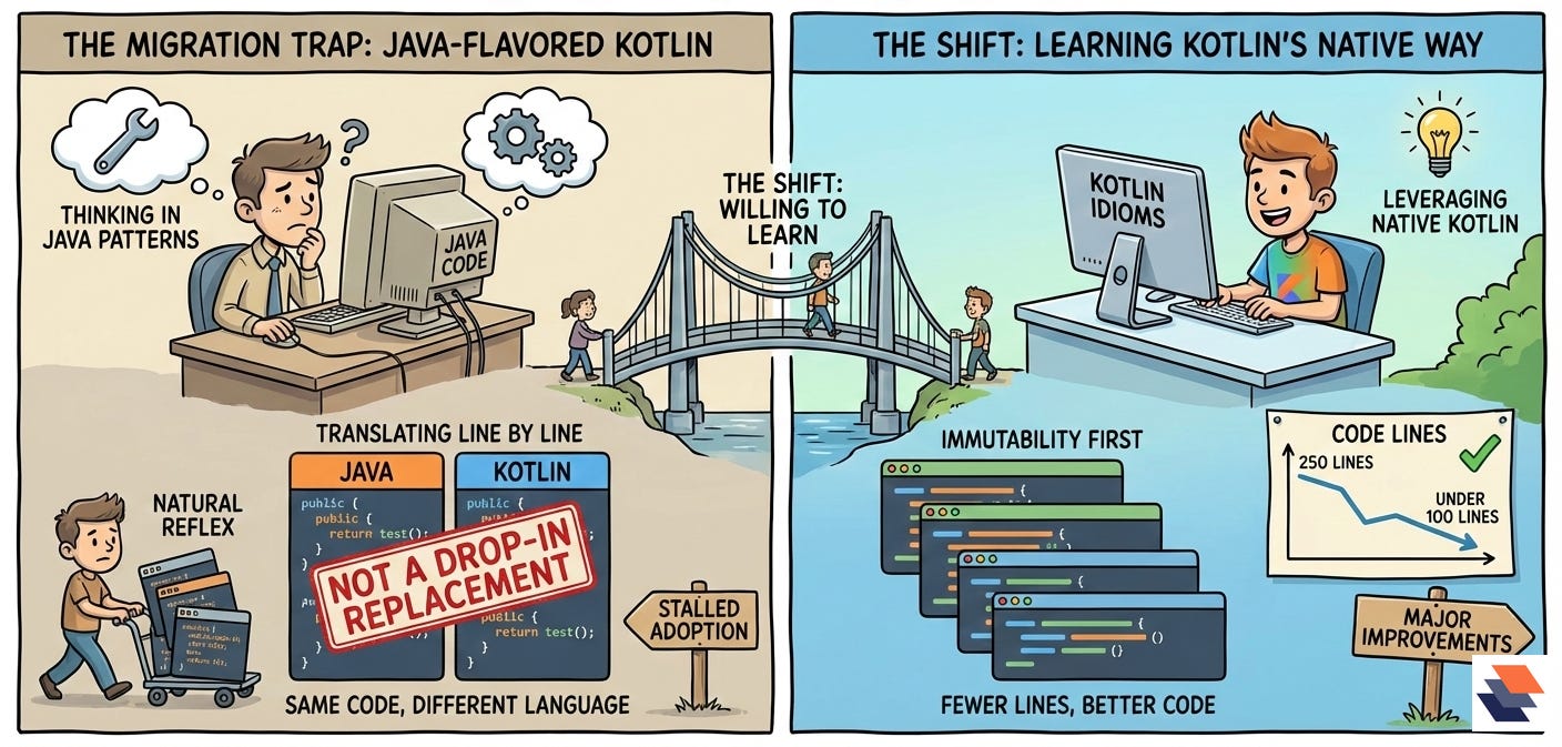 A language switch succeeds or fails in the space between code and people. Teams can adopt Kotlin fast and still ship Kotlin that behaves like Java. The most useful guidance is keeping modernization practical while systems keep running.