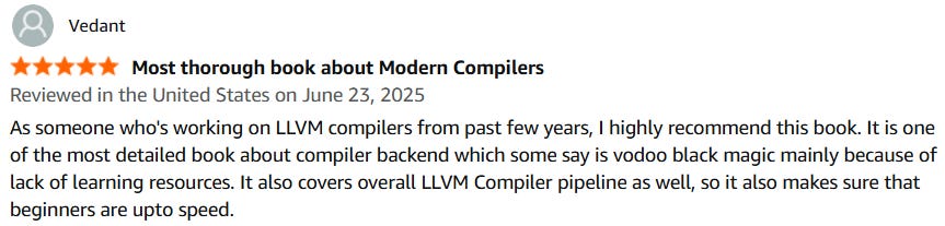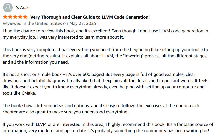 For some concepts, I wish I had gone further, but the book is already pretty big—I think it's around 600 pages—so I had to make cuts. I cut content that goes deeper into some guts of LLVM that aren’t necessarily useful unless you want to modify them.