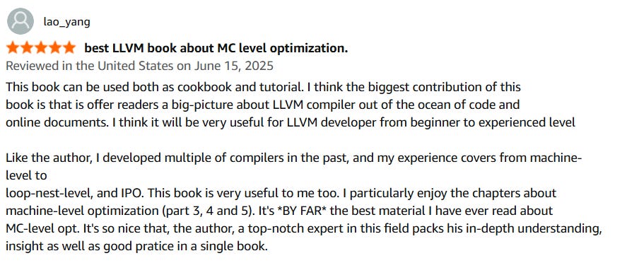 I'm exaggerating, of course, because writing a book is a lot of work, but that was the primary motivation: to give people resources to get started with LLVM. This is something we've discussed a lot within the community, especially around back end development, where there’s a big need because that part of LLVM is not well documented.