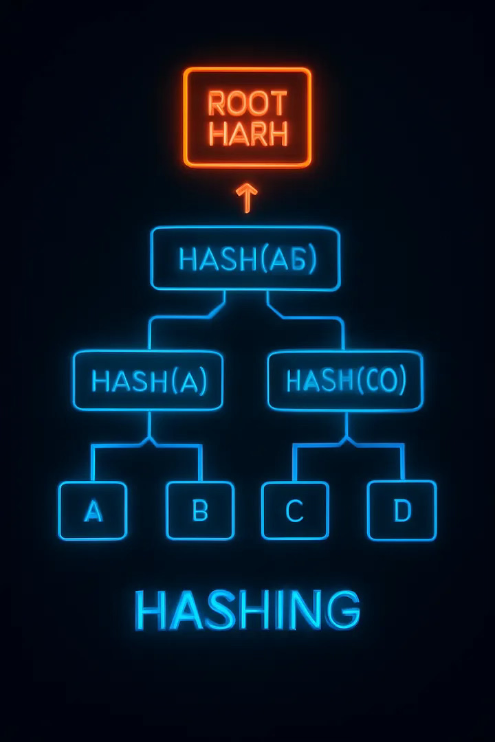 Leaf Nodes: Each one holds a hash of actual data — like an office’s transactions.