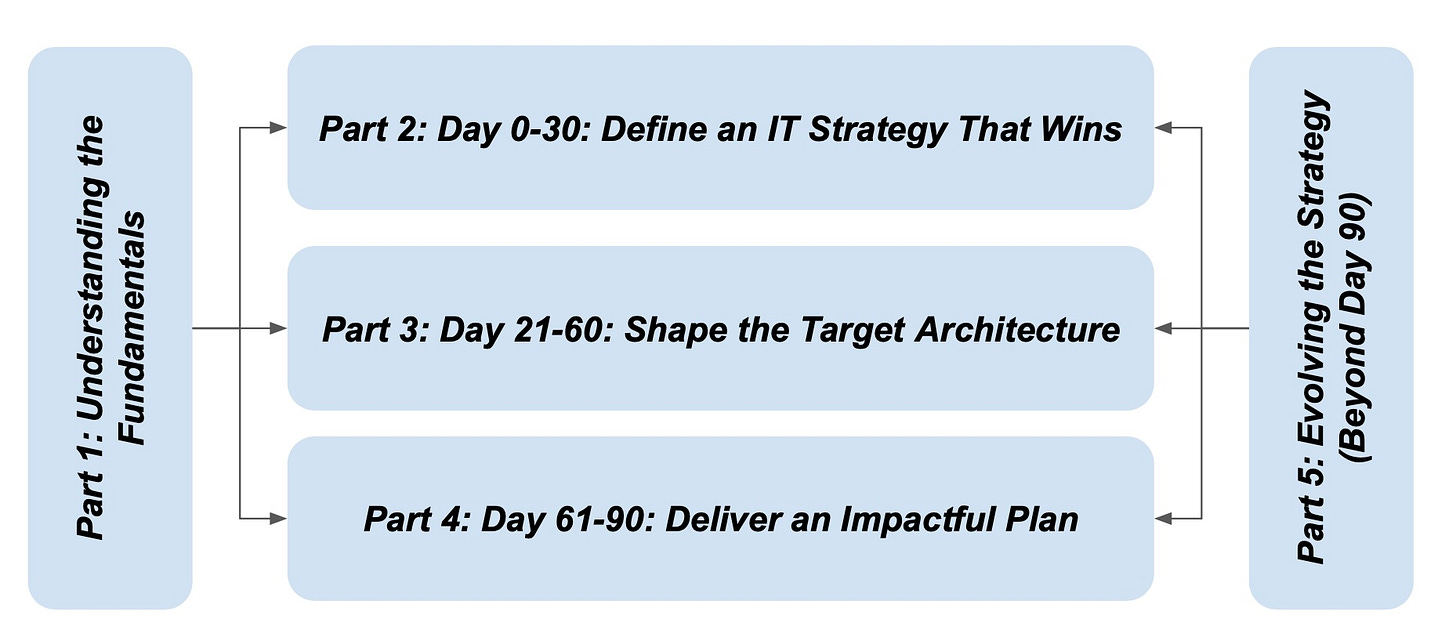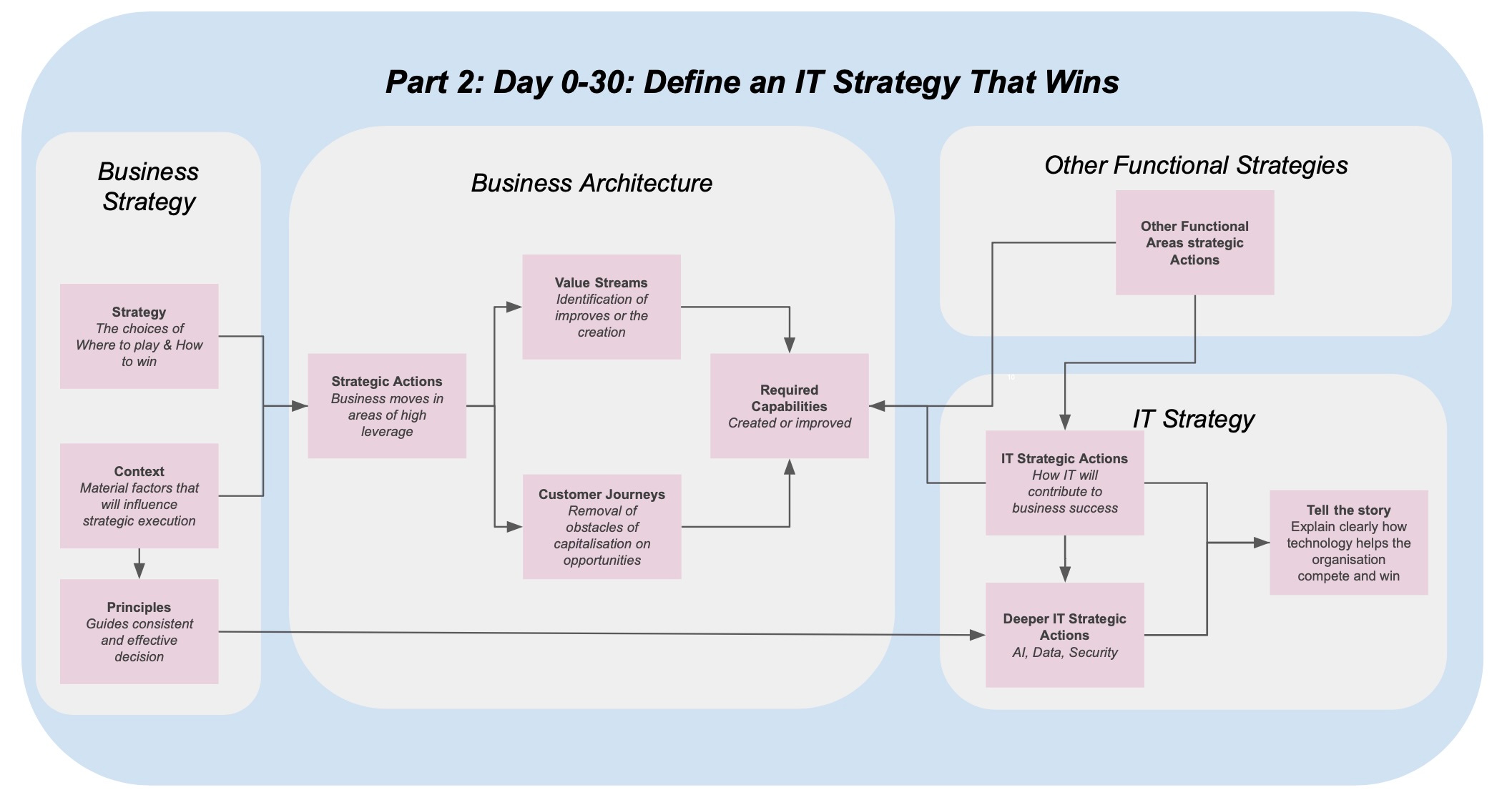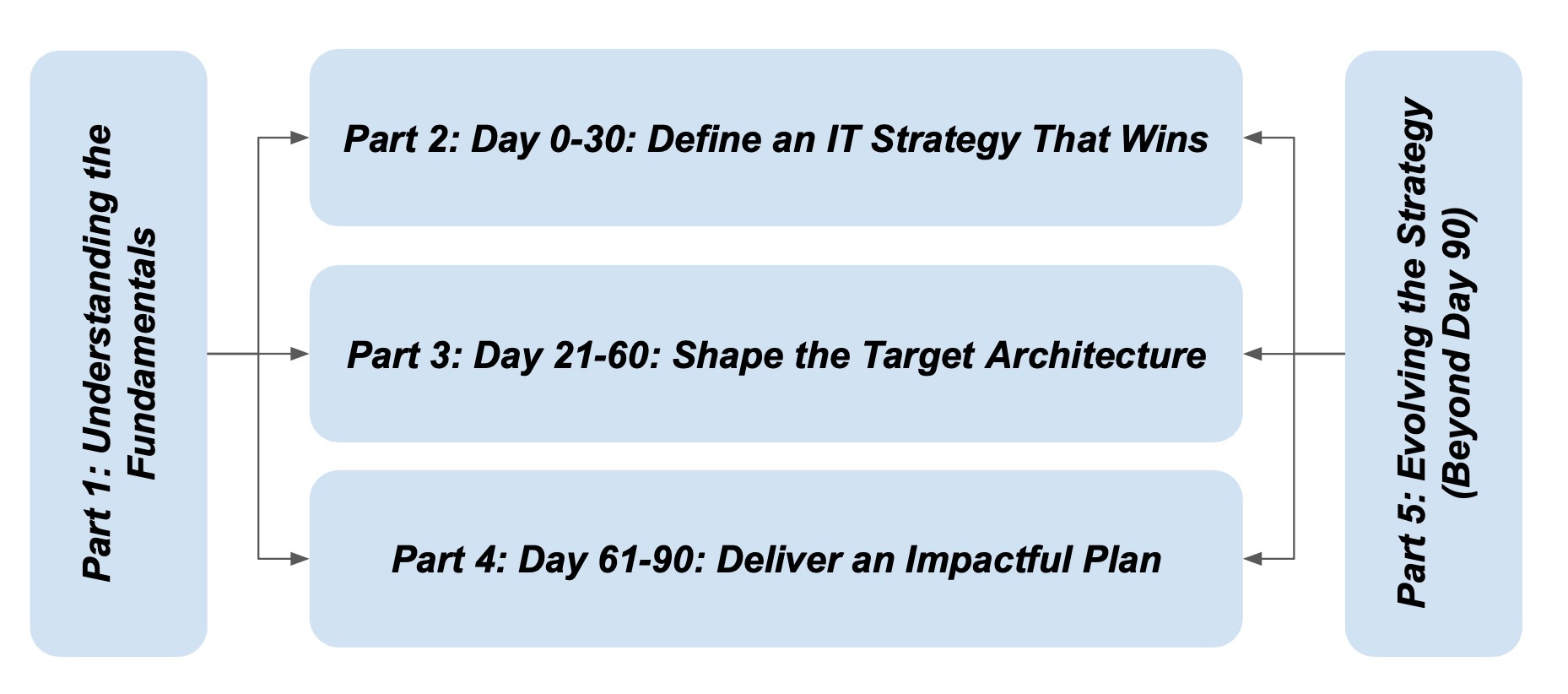 Part II: Day 0–30 — Define an IT Strategy that Wins — Establish the directional why and strategic what; translate business goals into capability enhancements and IT actions; culminate in a communication plan that ties every action to business success.