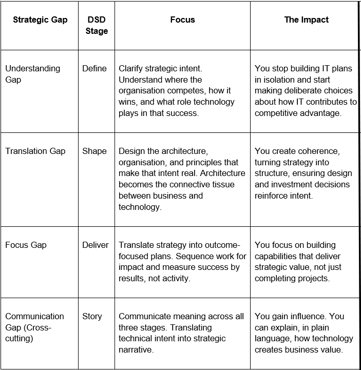 The Translation Gap: The disconnect between IT’s strategic contribution and the enabling architecture. High‑level intent never becomes coherent design, resulting in fragmented, fragile systems.