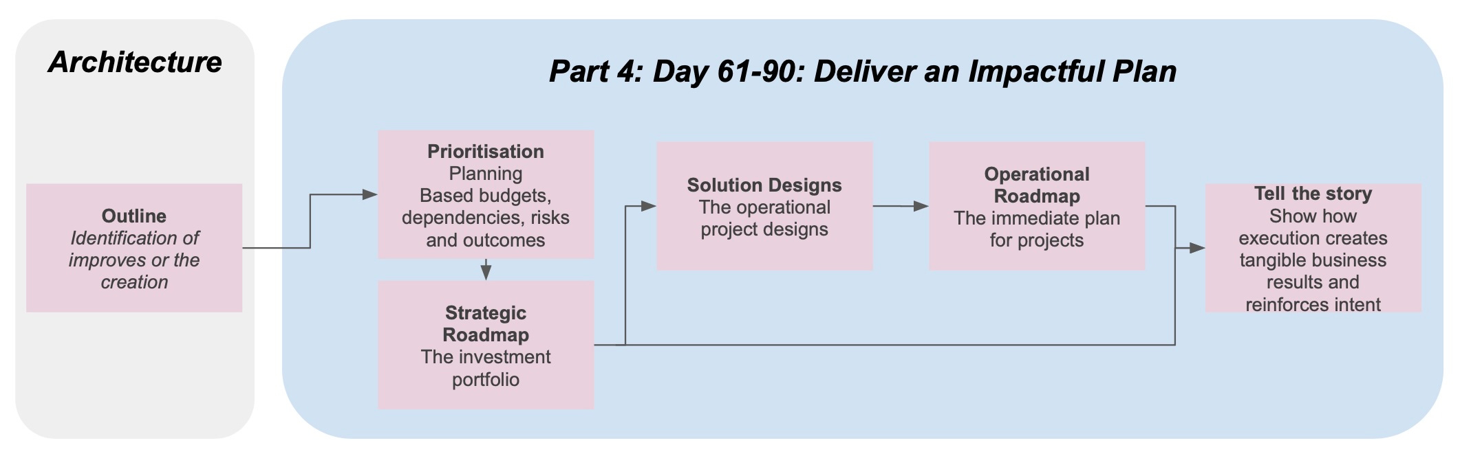 Part IV: Day 61–90 — Deliver an Impactful Plan — Prioritize by value and constraints; form the strategic roadmap and short‑term operational plan; communicate for investment sign‑off by focusing on measurable impact.