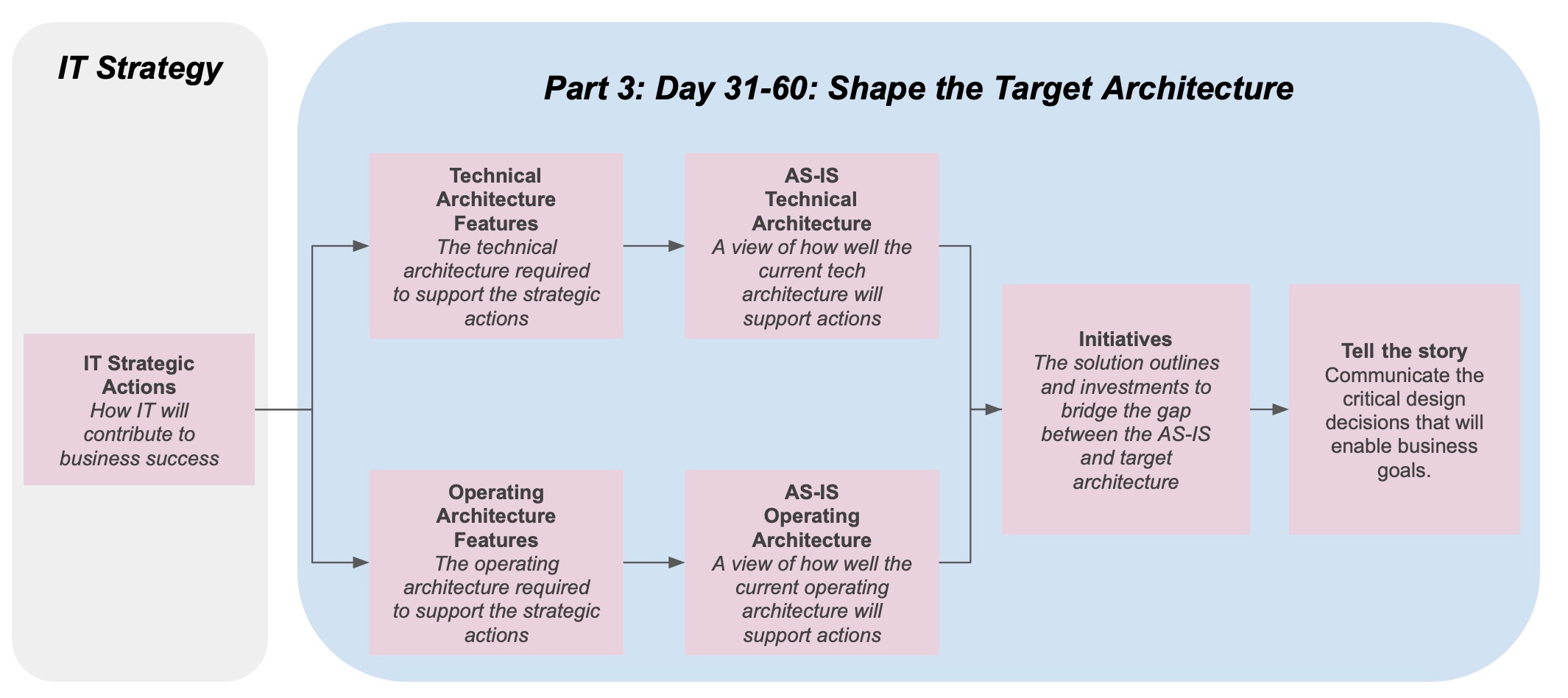 Part III: Day 31–60 — Shape the Target Architecture — Move from intent to socio‑technical design: technology, teams, operating model, and governance; understand the AS‑IS, outline initiatives, and tell the story of value.